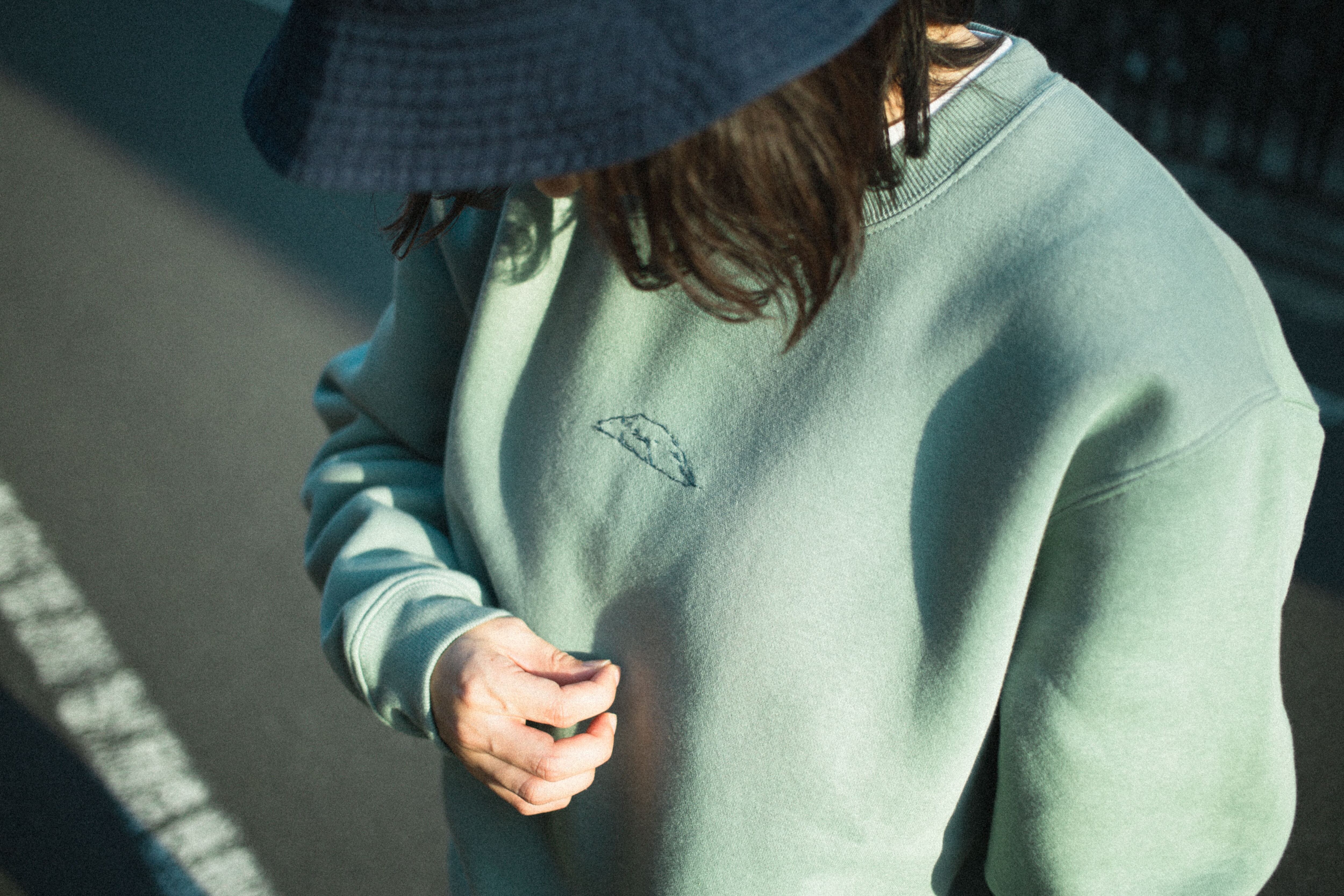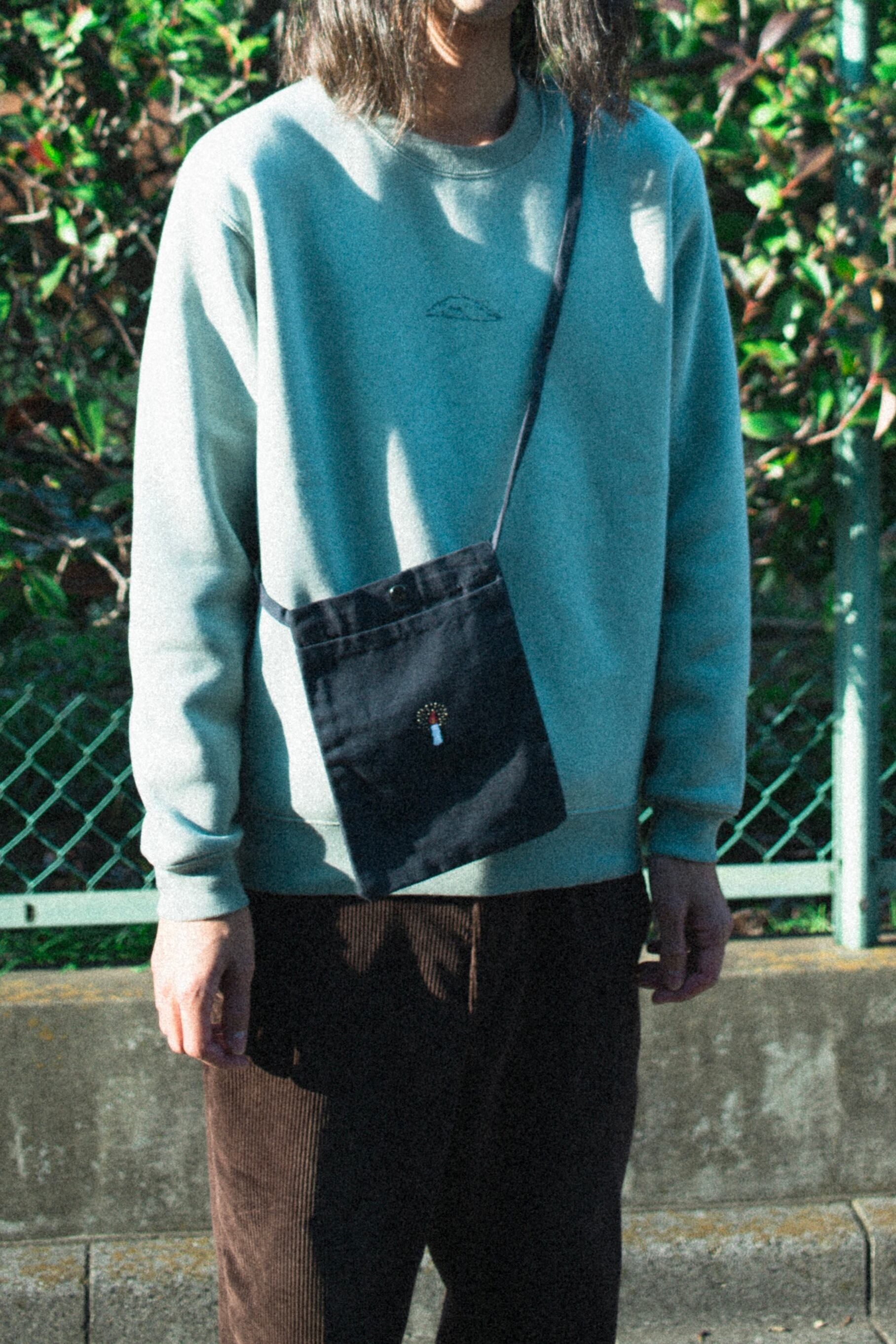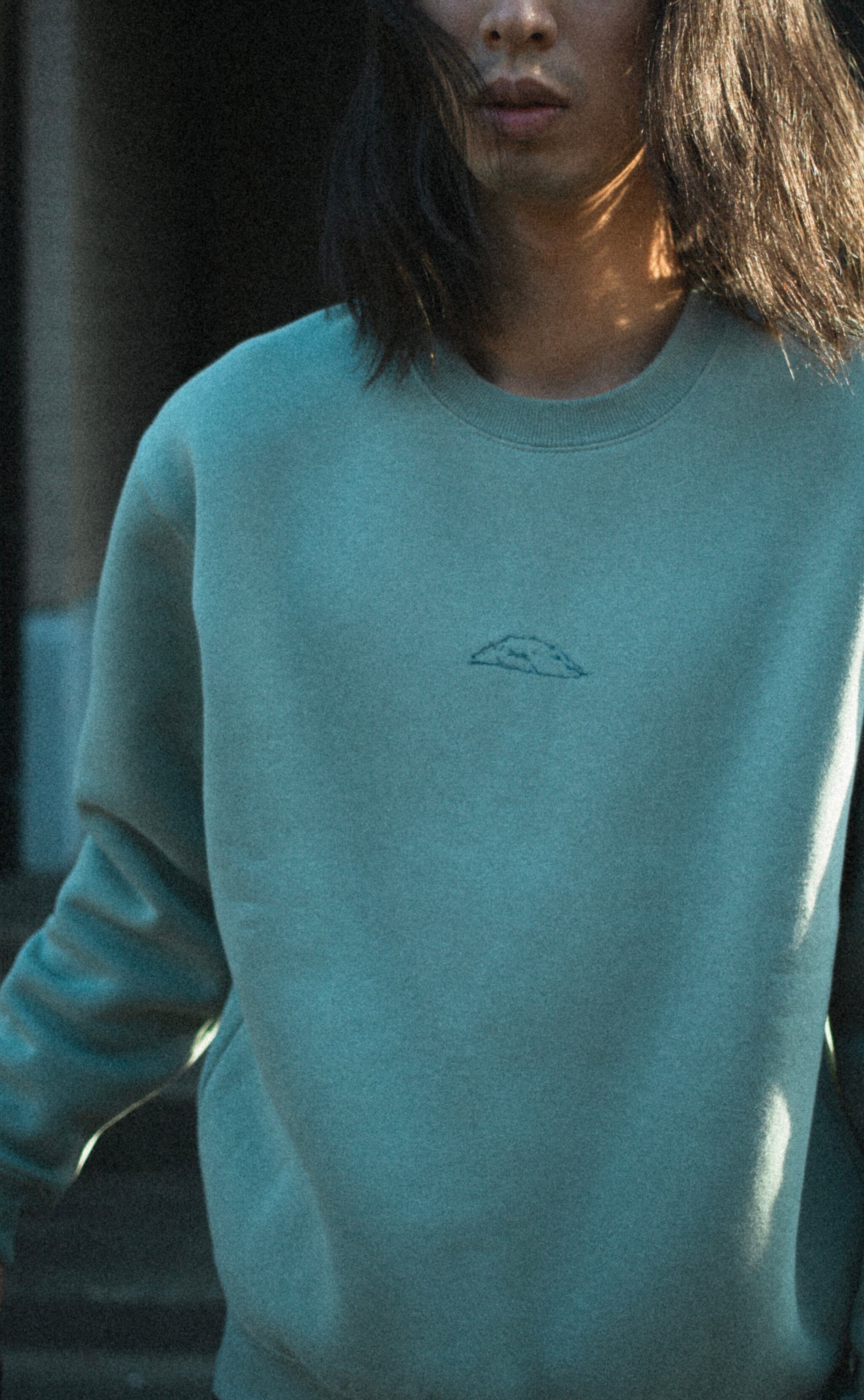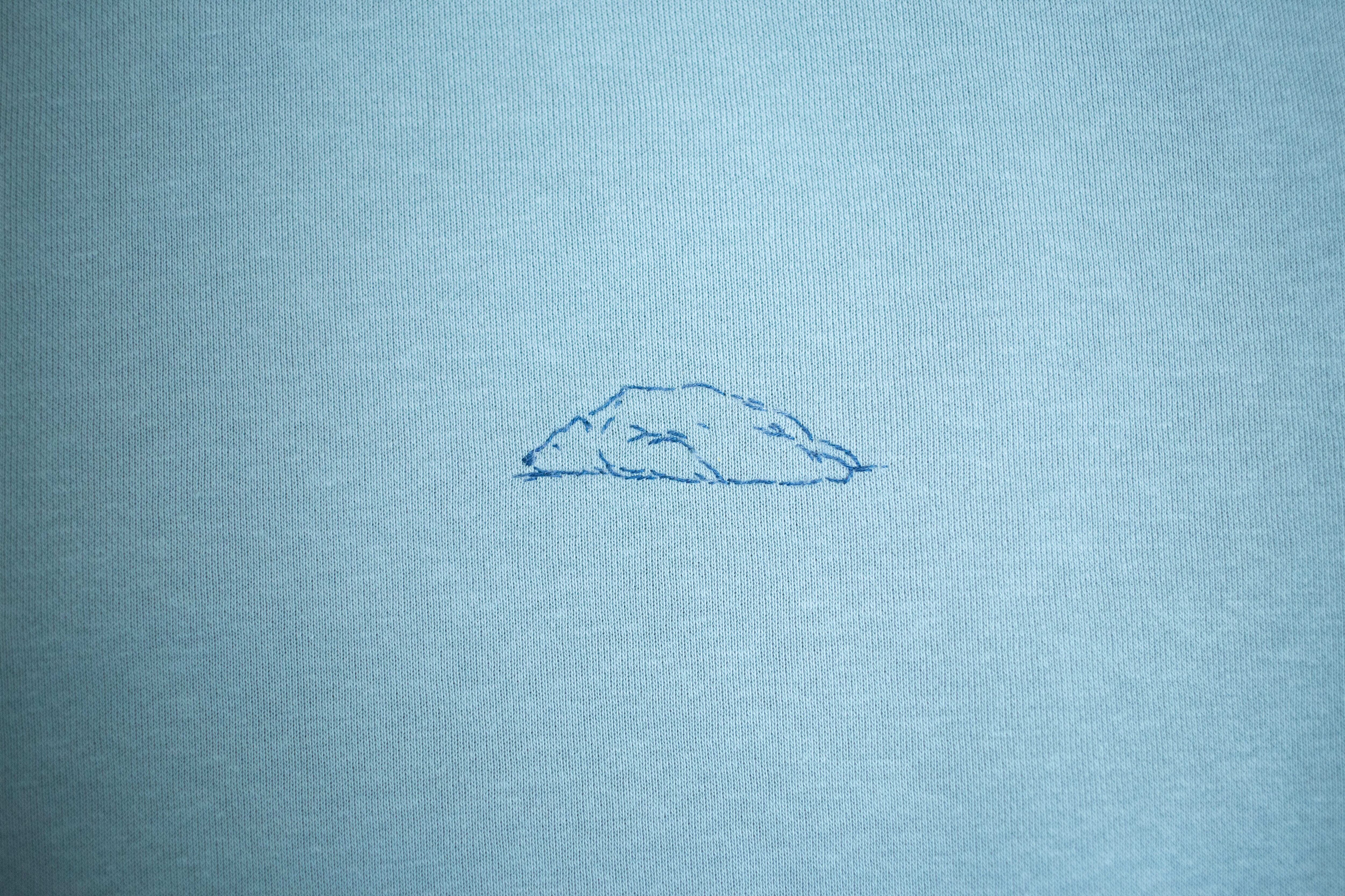 色の綺麗なスモーキーグリーンのスウェットにネイビーの糸で刺繍しています。
